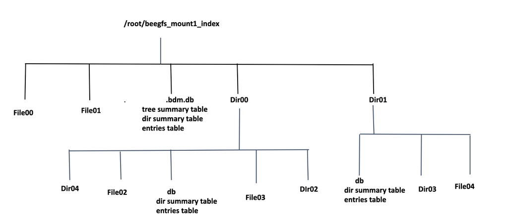 In the In-Tree Index method, the index is created directly inside the BeeGFS filesystem. Each subdirectory will contain a separate .bdm.db database file, which holds metadata specific to that subdirectory. The database stores detailed metadata information about the files within the directory, such as filenames, timestamps, file size, extended attributes, and more.